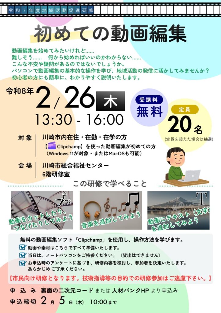 対 象:川崎市内在住、在学、在勤の方で【Clipchamp】を使った動画編集が初めての方