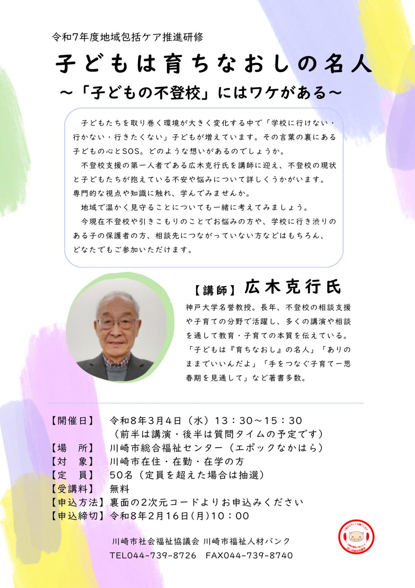 不登校支援の第一人者である広木克行氏を講師に迎え、不登校の現状と子どもたちが抱えている不安や悩みについて詳しくうかがいます。専門的な視点や知識に触れ、学んでみませんか。