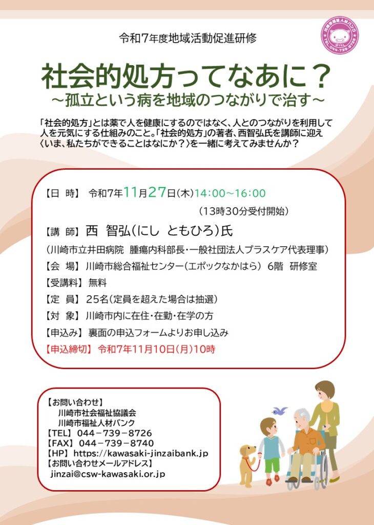 「社会的処方」の著者、西智弘氏を講師に迎え、社会的処方について学びます。「孤立」の現状を知り、地域の中でどのようなつながりが大切なのか理解を深め、「自分にできること」を一緒に考えてみませんか。